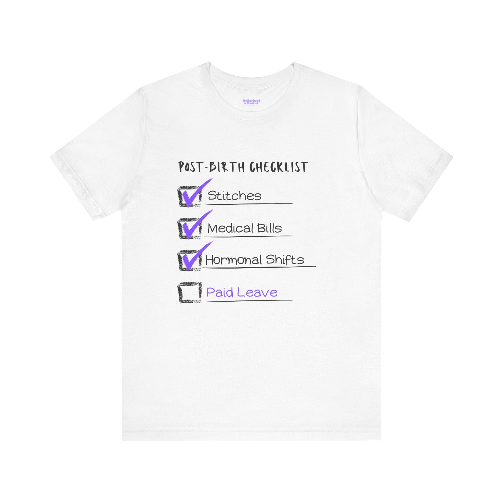 The Post-Birth Checklist Unisex Tee sparks bold conversations about the reality of postpartum recovery and the urgent need for paid family leave. This statement piece highlights what mothers endure after giving birth and what’s still missing: support.